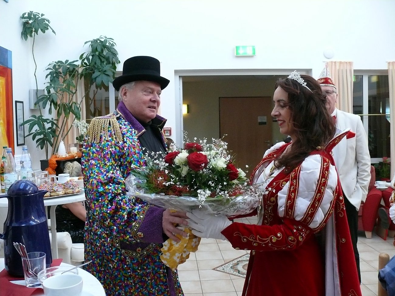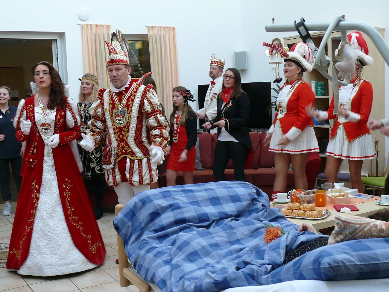 Am Veilchendienstag der diesjährigen Session nahmen sich die Jecken der KG Rot-Weiß Denklingen Zeit, dem Johannes-Hospiz Oberberg ihren traditionellen Besuch abzustatten. Mit Teilen von Schmölzchen und Elferrat und in Begleitung von Präsident Hansi Welter hielten Prinz Rüdiger I. und seine Prinzessin Caroline Hof im Atrium des Hauses, dessen Arbeit sich die Karnevalisten seit sechs Jahren zur Herzensangelegenheit erkoren haben.