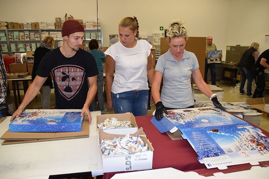Beim Packen haben an einem Samstag in zwei Schichten 40 Menschen mitgeholfen. Ehrenamtlich dabei waren Mitarbeitende der Hospizstiftung, Malteser-Mitarbeitende, Mitglieder aus dem Förderverein der Hospizarbeit und aus dem Johannes-Hospiz der Johanniter sowie auch zahlreiche Berge-Mitarbeitende. Morgens um acht Uhr ging es los, um halb drei war alles fertig: Pappkartons zusammengesetzt, die jeweils 24 Fächer befüllt, die blaue Pappe gefaltet und die Kalender eingeschweißt.