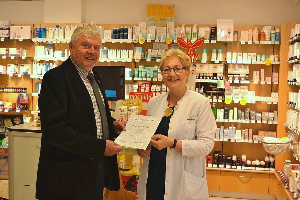 Für ihre Spende erhielt die Wiehler Apothekerin Nora Schäfer eine Urkunde der Johannes-Hospiz Oberberg Stiftung von Stiftungsmitarbeiter Dr. Jorg Nürmberger