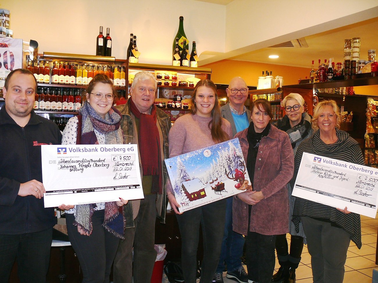 Mit ihrer zweiten Weihnachtskalender-Aktion für die gute Sache erzielten die Auszubildenden der Firma Delikatessen Wolfram Berge einen stattlichen Gesamterlös über 15.000 Euro. Über die daraus resultierenden Spenden von jeweils 7500 Euro freuten sich jetzt der Ambulante Kinder- und Jugendhospizdienst Aggertal der Malteser und die Johannes-Hospiz Oberberg Stiftung.