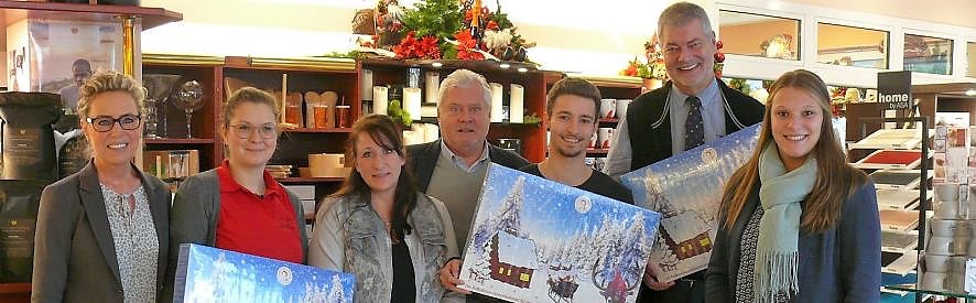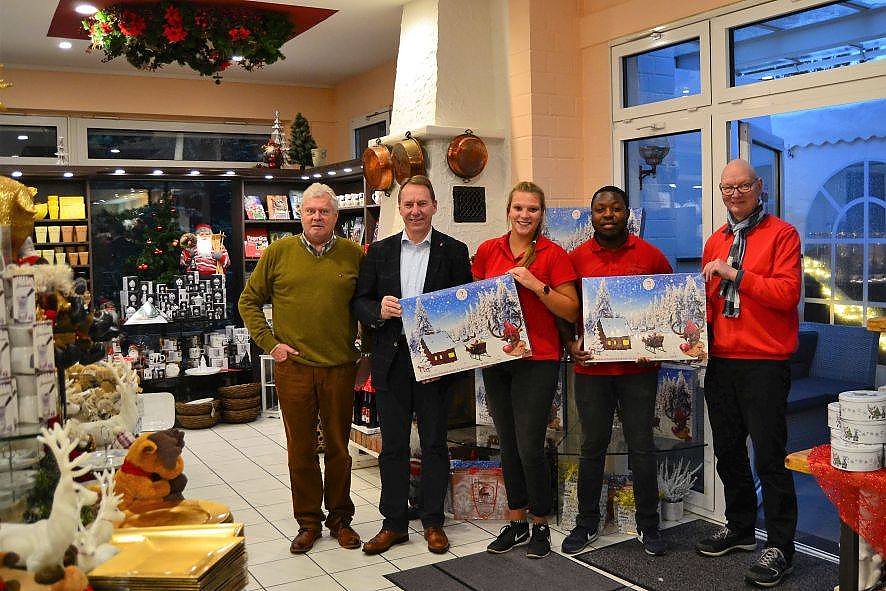 Als „Geschenke für Menschen mit ganz besonderen Aufgaben“, hatte der oberbergische Landrat Jochen Hagt (unten, 2.v.li.) die Kalender bei Delikatessen Berge erstanden. Wer dann vom Oberbergischen Kreis damit beschenkt worden ist, kann sich über 24 Leckereien hinter den Törchen freuen. Hinter ihnen verbergen sich nämlich Köstlichkeiten wie die Tessiner Senfsauce, das gelbe Paprikagelee, Dip-Kreationen und jede Menge süßer und herzhafter Naschereien.